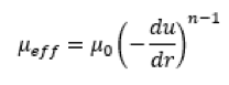Many biologic formulations exhibit shear dependant Power Law behaviour at higher concentrations. (3) Power law fluids demonstrate a time independent log-log relationship between shear (du/dr ) and viscosity (μeff) described by: