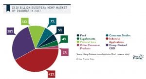 Fig. 3 shows that Europe has developed both a strong processing infrastructure and a finished goods industry based on using hemp fibers in industrial applications. It is the largest current market segment for hemp in the region, at 42%. Furthermore, New Frontier Data predicts that sales of hemp-based industrial products will post the strongest growth of any hemp sector over the next five to 10 years.