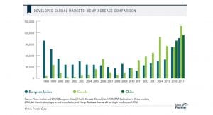 Today, Europe is estimated to produce close to 1/4 of the world’s hemp crop. While the continent had been the historical global leader in hemp production until about 2010, it has recently been surpassed by Canada, with China has quickly catching up (see Fig. 4). France alone accounted for 40% of the European acreage, with at least 20 other countries contributing to the European Union’s total.