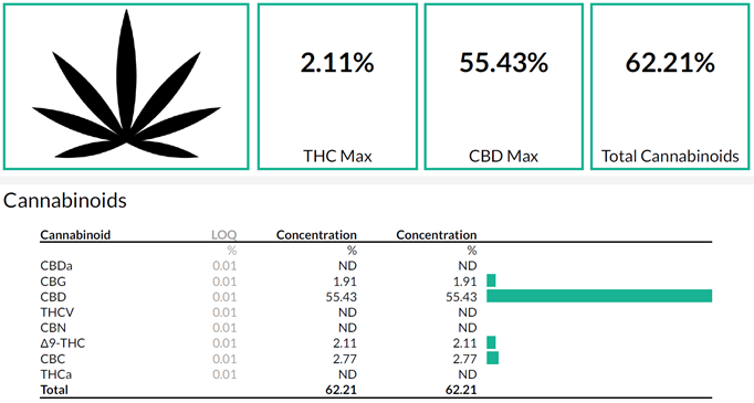Below are example test results showing the results of the THC remediation process. Staring oil has 2.11% THC and 3 more cannabinoids CBG, CBD and CBC.